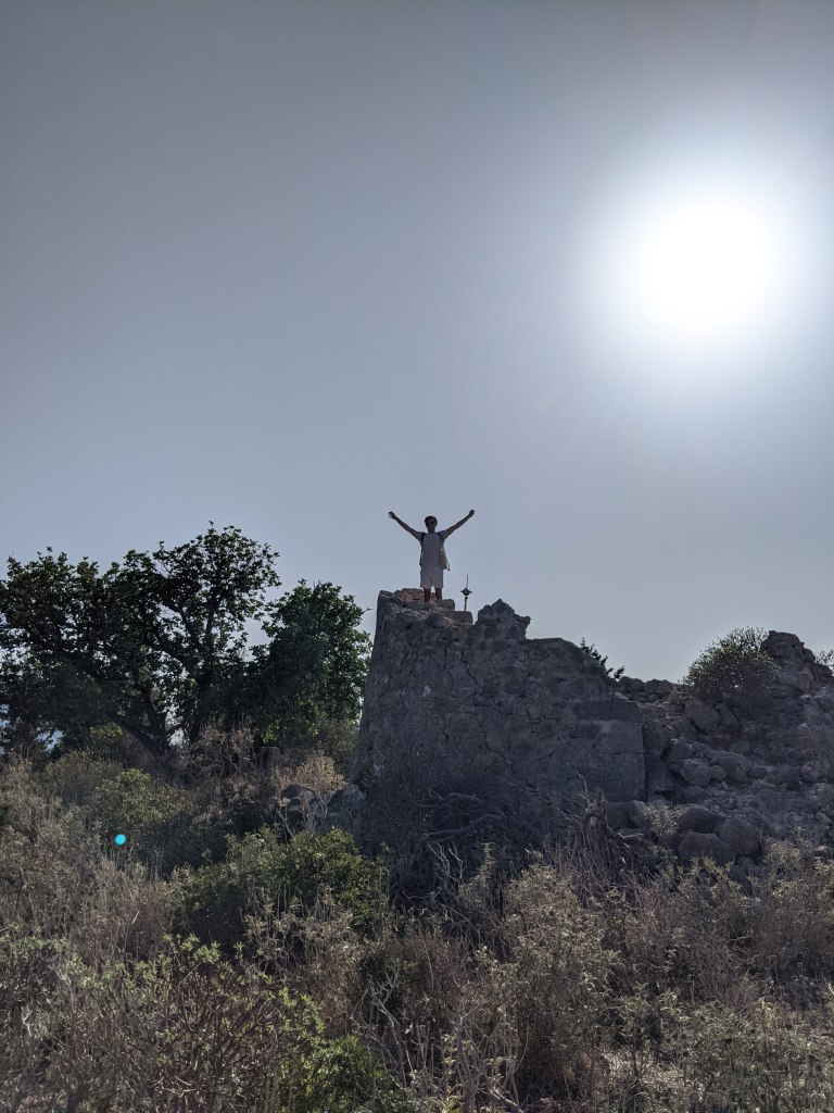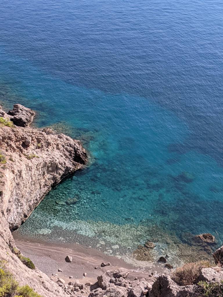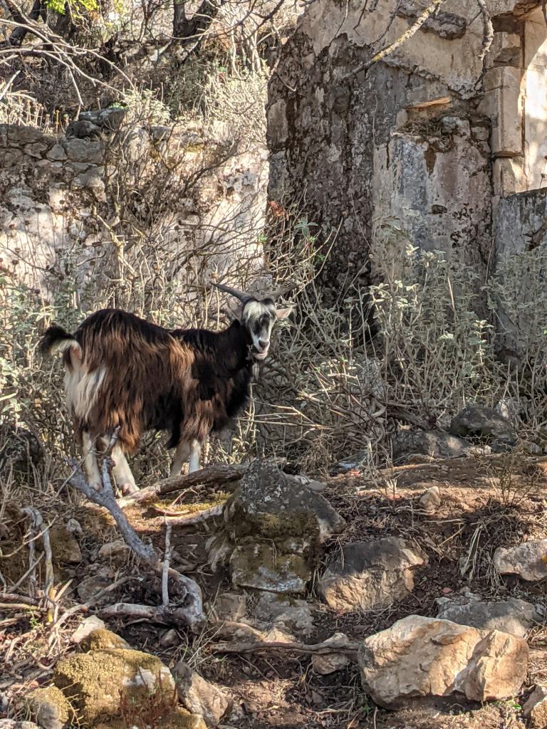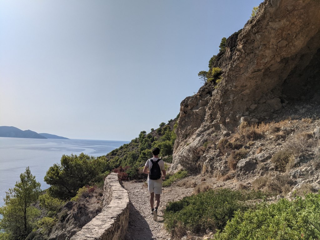We persevered with getting to the highest point that we could, my face slowly getting closer and closer to neon red. It transpired that the best views were those on the path back down the paved route and the alternative side path we had already taken, but that sense of achievement from crawling up that last ruined stair was still worth it. The sweat dripping down my nose, the sound of my my panting and the tinkle of goat bells… all synonymous with a great Greek hike.