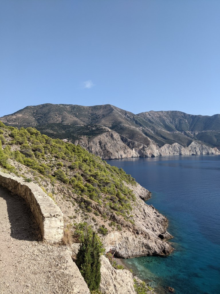 Assos itself is so very tiny and there are really only a couple places to get a drink, all of which were busy and expensive. Nevertheless we got some cold drinks to pass some time before deeming the sun low enough in the sky to start the climb up to the castle. We were there in late September, late afternoon, and it was a very hot and sweaty climb, be prepared! We may have made things slightly harder by leaving the paved path and winding round the outside of the old wall though, which meant a lot more clambering and less shade, but some pretty wonderful views! Instead of looking back down towards Assos, going round this side meant we could see across the bay towards Myrtos and also had the late afternoon sun making everything glow as we walked.